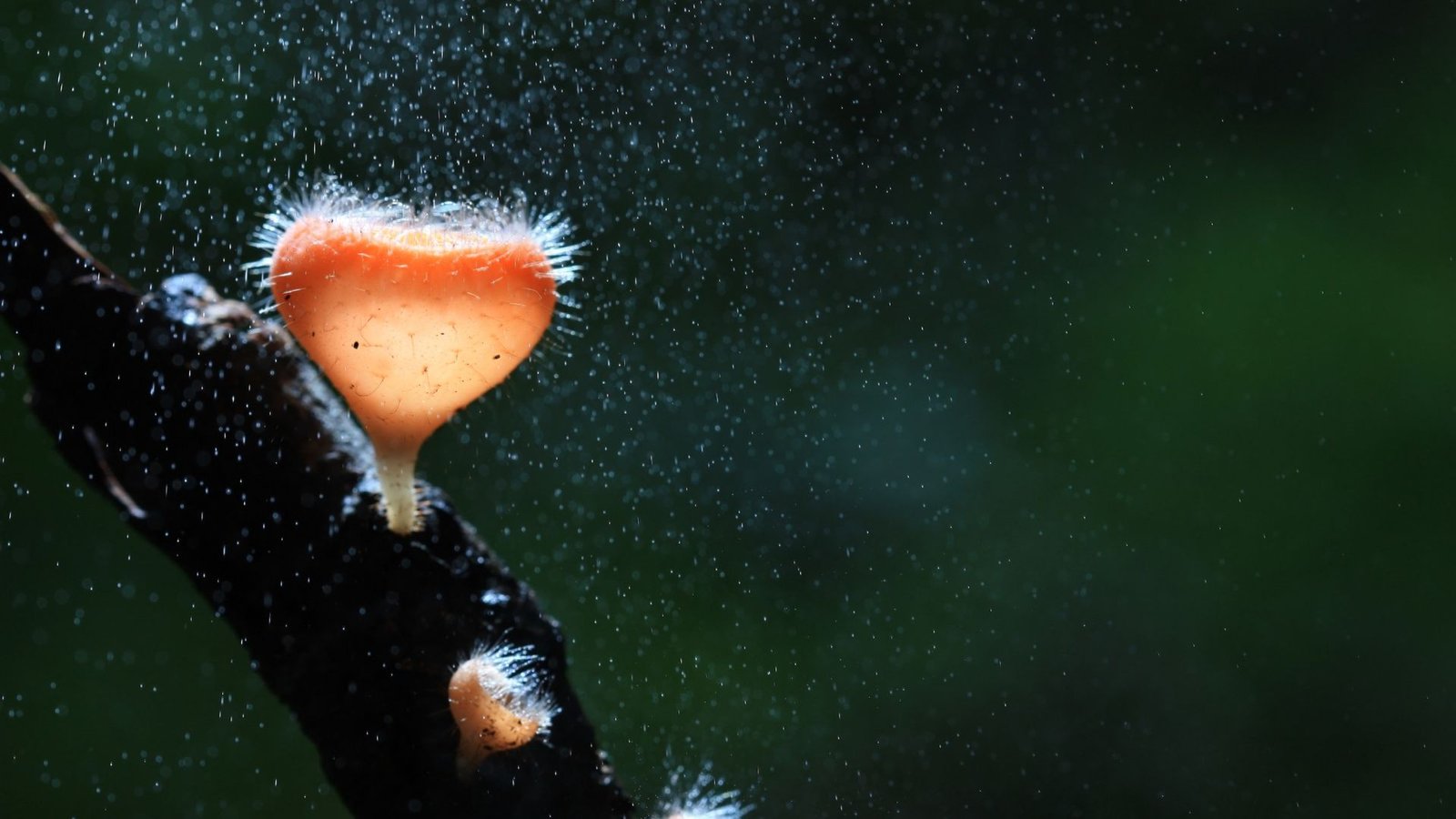 Cup surface is superhydrophobic—raindrops bead and catapult spores up to 30 cm.