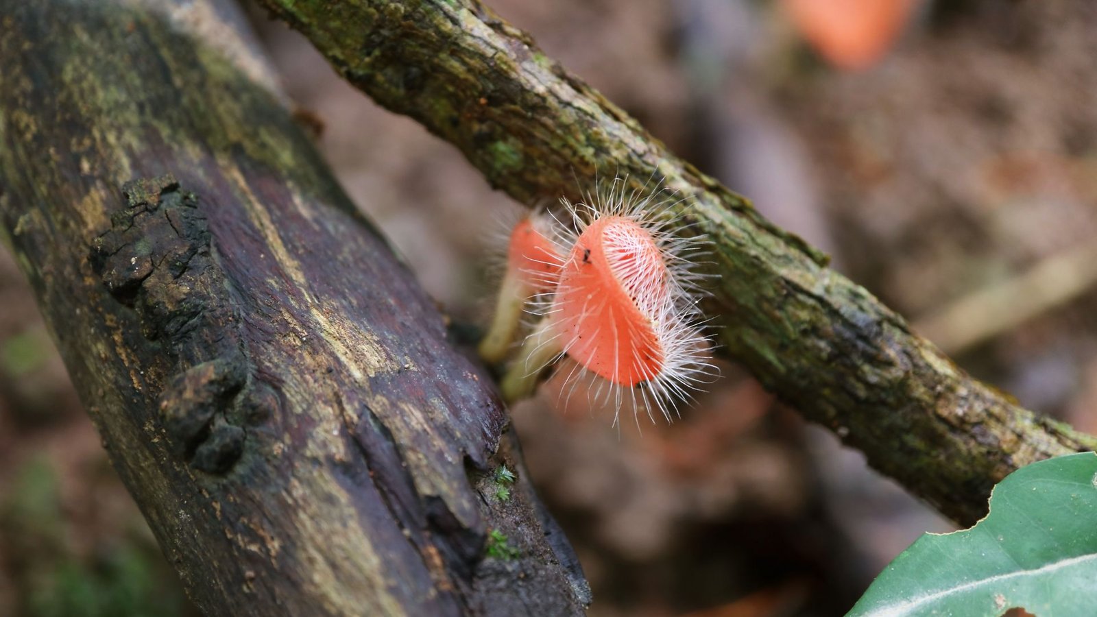 Apothecial, stalked cup fungus 1 – 3 cm in diameter held atop a slender, whitish stipe 2 – 5 cm tall. Cup exterior and limb densely covered with fine white to translucent bristles (setae) 1–2 mm long; inner hymenial surface smooth, vivid salmon‑pink to orange. Flesh thin, rubbery; when hydrated the cup margin flares outward. Asci cylindrical, eight‑spored; ascospores hyaline, ellipsoid, 40 – 48 × 6 – 8 µm with guttules. Emits no noticeable odour. Often fruits in small, trooping clusters on well‑decayed hardwood sticks.