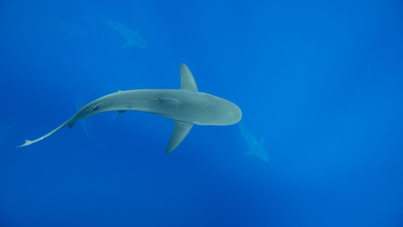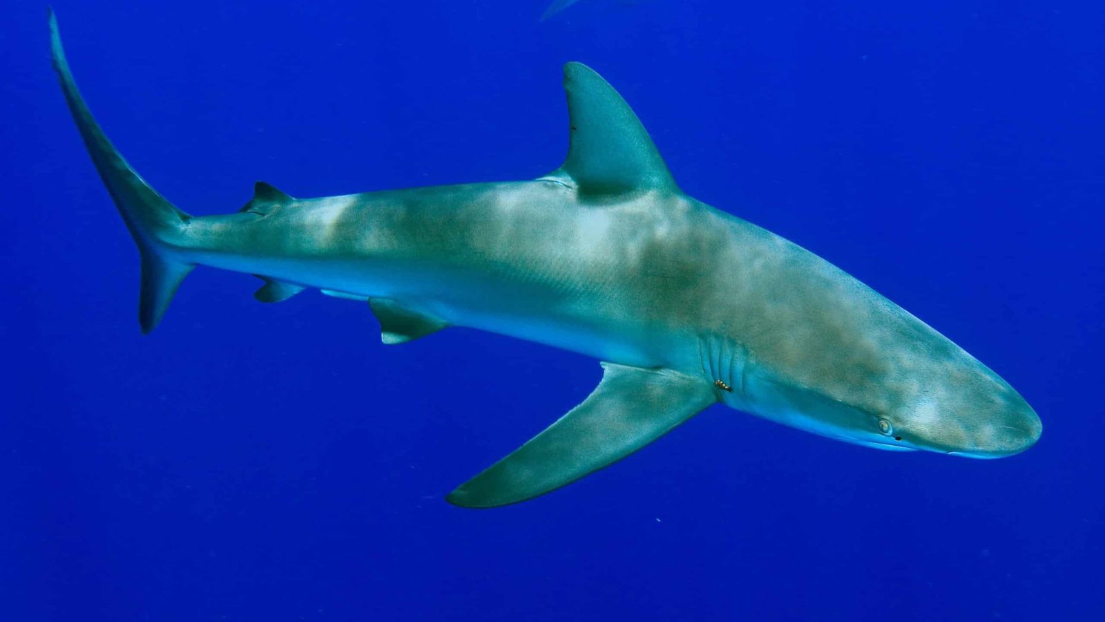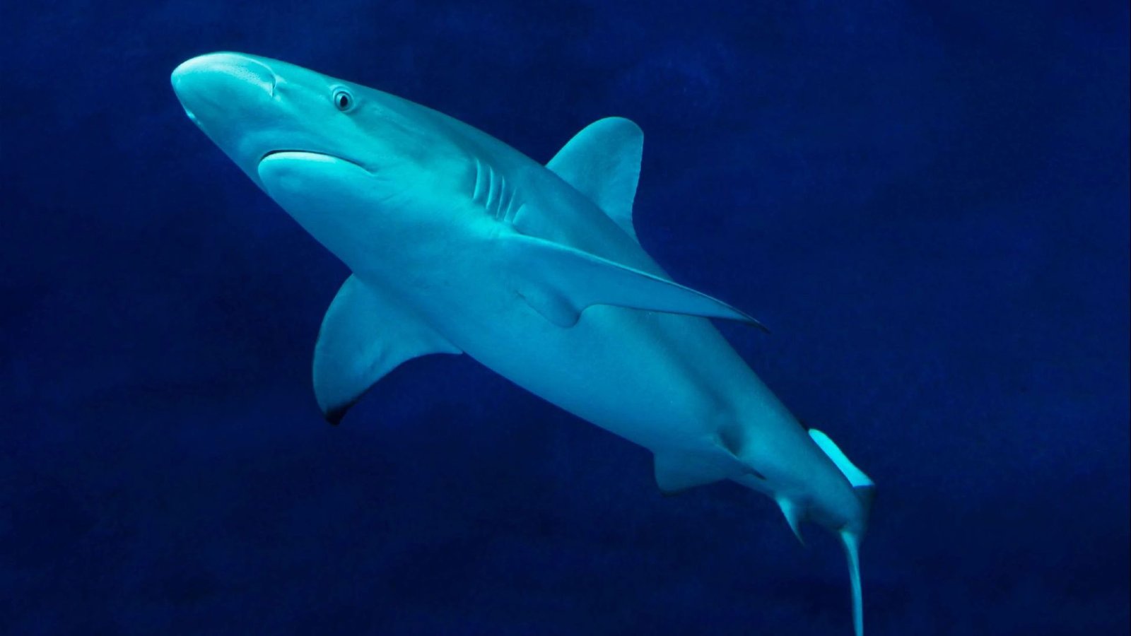 Juvenile pigmentation (darker fin edges) fades as shark matures.