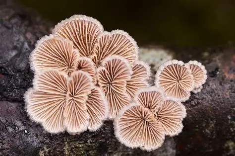 Small, fan‑ to shell‑shaped basidiocarps form layered brackets 1–4 cm across and ≤ 5 mm thick. Upper surface is grey‑white to tan, densely tomentose, often zoned; the underside bears 2–6 radiating folds whose halves split longitudinally and close in dry weather, reopening when re‑hydrated. Margin frequently wavy or lobed. Stalk absent; attachment lateral or central. Flesh tough, cartilaginous. Spore print white. Microscopic features include hyaline, cylindrical basidiospores (3–4 × 1–1.5 µm) and clamp connections. Fruiting bodies develop singly or in imbricate tiers on decaying hardwood; they can desiccate for months and revive repeatedly.