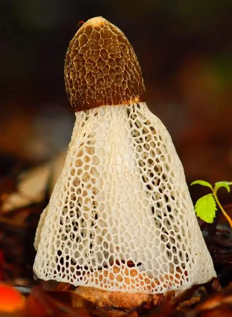 Erect, phalloid basidiome 15 – 25 cm tall arising from an ovate “egg.” Stipe white, spongy, honey‑combed (2–3 cm Ø) supporting an olive‑brown, slimy gleba on a conical cap (4–5 cm Ø) with reticulate pits. A delicate white lace‑like indusium (8–20 cm long) hangs from beneath the cap, forming a cylindrical skirt that may reach the substrate. Volva thick, white; base rooting. Gleba emits strong carrion‑like odour to attract dipteran vectors. Spores hyaline, elliptical, 3.5 × 2.0 µm. Basidiome matures rapidly (≈ 10 h) and collapses within 1–2 days.