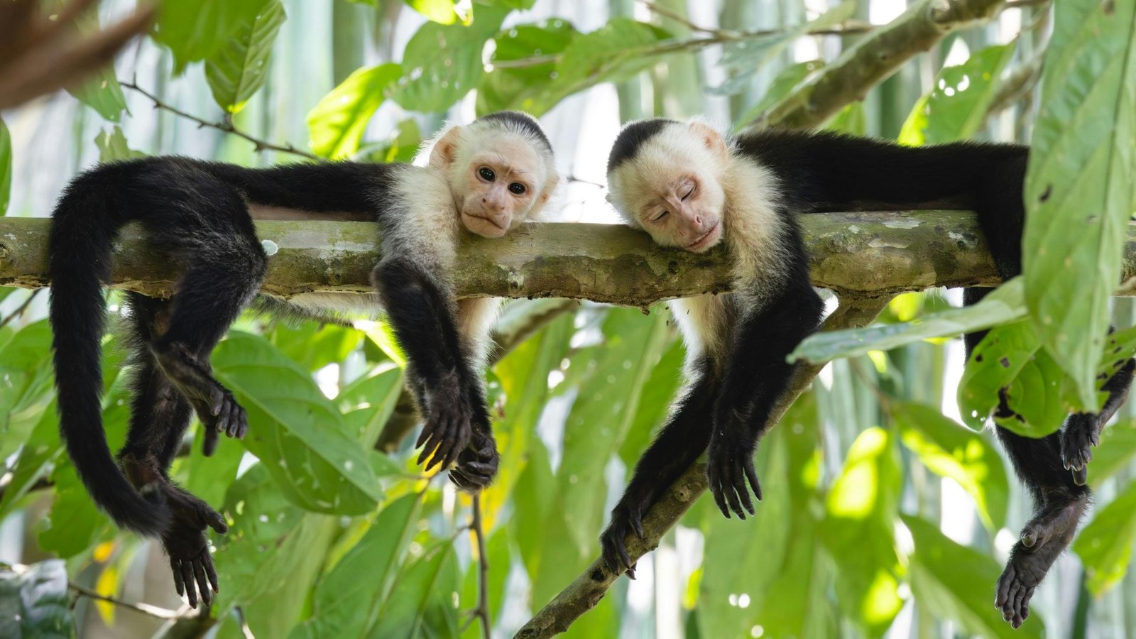 Small, highly agile New‑World monkey distinguished by a creamy‑white face, throat, shoulders and chest that contrast sharply with glossy black limbs, back and tail. Crown sports a dark “cap” bordered by a pale brow band. Head–body length 33–45 cm; prehensile tail 40–55 cm equals or exceeds body length and is furred to tip. Adult males weigh 3.4–4.8 kg (mean ≈ 3.9 kg), females 2.5–3.9 kg. Limbs are long and gracile with curved digits for rapid quadrupedal and arboreal travel; hind limbs proportionally longer, facilitating 3–4 m leaps. Dentition features robust premolars and canines suited to cracking hard fruits and arthropod exoskeletons. Infants are born pale grey‑pink, developing adult coloration by three months. [1][3]